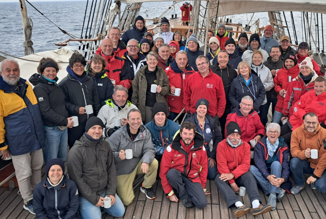 Jeudi 16 octobre. Nous appareillons à midi ce jeudi avec 45 stagiaires à notre bord, retardés par un sous-marin en sortie de la rade de Brest. Si les prévisions météo nous promettent du soleil pour ce stage, elles nous imposent en revanche un challenge quant au vent : du Nord-Est pour la première partie du stage, puis du Sud-Est ensuite. Nous avons donc mis à profit le retard à l’appareillage pour former nos stagiaires à la traditionnelle « ronde des cabillauds », afin de pouvoir établir de la toile dès la sortie du goulet de Brest. Nous faisons ainsi route avec nos voiles d’étais en mer d’Iroise, passant devant les Tas de Pois avant de rejoindre le Raz de Sein, le courant avec nous. Sitôt passé le mythique passage du Raz sous une météo radieuse, nous établissons toutes nos voiles carrées et serrons le vent bâbord amures, faisant route au Sud jusqu’au milieu de la nuit. Le ciel étoilé fut magnifique cette nuit-là ; nous eûmes également la visite de dauphins venus jouer le long du navire, leurs contours éclairés de phytoplanctons.